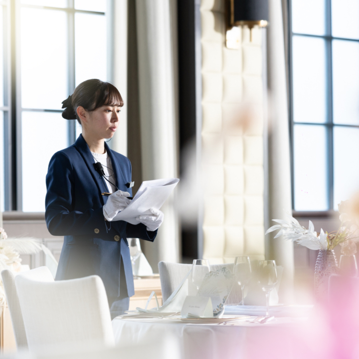 新郎新婦様の想いをしっかり受け取り、ウエディングプランナーやキッチン、音響・サービススタッフなど、すべての部門をまとめながら進行を管理。